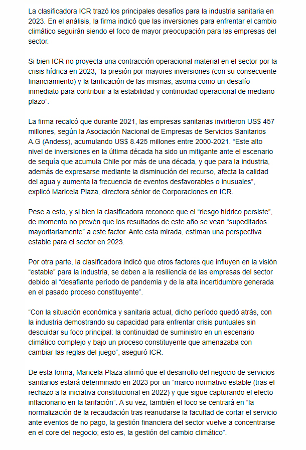 EL MERCURIO – Las empresas sanitarias invirtieron US$ 457 millones, según Andess, acumulando US$ 8.425 millones entre 2000-2021.