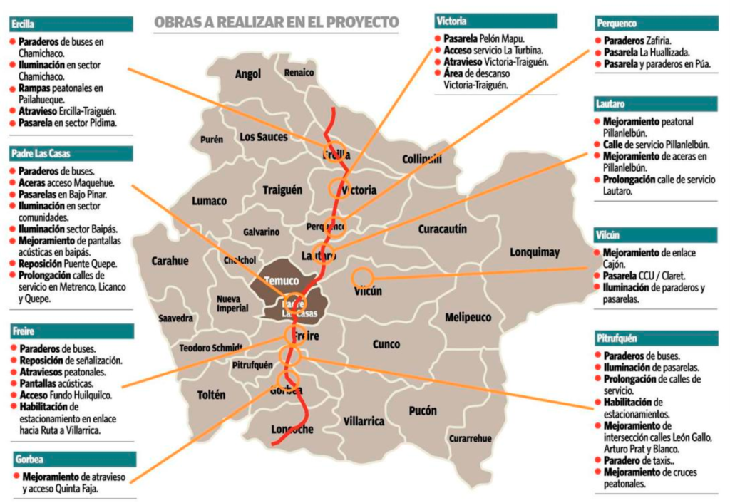 Se trata de cien proyectos de distinta magnitud que buscan mejorar la operatividad de la carretera y también mejorar los estándares de seguridad vial para los usuarios, tanto automovilistas como peatones de las comunas de Ercilla, Victoria, Perquenco, Lautaro, Vilcún, Padre Las Casas, Freire, Pitrufquén y Gorbea.