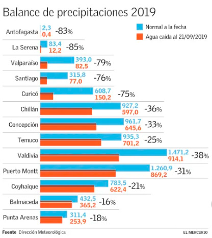 De hecho, entre el 21 de julio y el 21 de septiembre en Santiago precipitaron 59,2 mm, cuando lo normal es 198 mm; en Valparaíso, 70 mm de un normal de 255 mm; en Curicó, 83,2 mm, cuando lo normal es 393 mm; mientras que en Concepción, 421,6 mm, cuando lo normal es 582 mm.