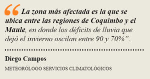 El especialista explica que la zona más afectada es la que se ubica entre las regiones de Coquimbo y el Maule, en donde los déficits de lluvia que dejó el invierno oscilan entre 90 y 70%.