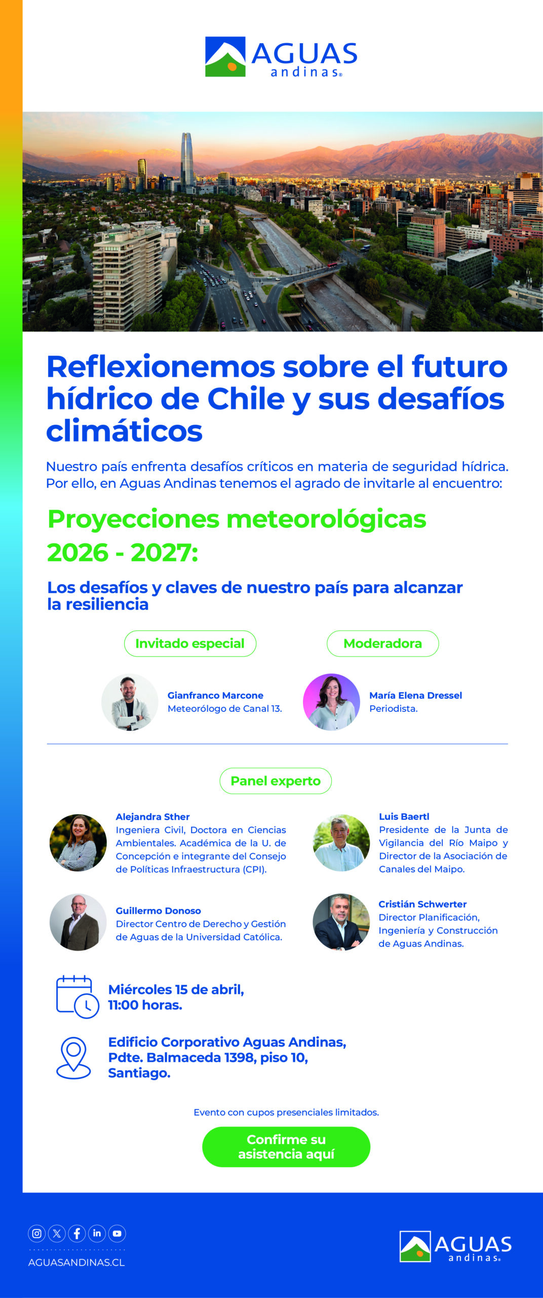 AGUAS ANDINAS – Nuestro país enfrenta desafíos críticos en materia de seguridad hídrica. Por ello, en Aguas Andinas tenemos el agrado de invitarle al encuentro: Proyecciones meteorológicas 2026-2027: Los desafíos y claves de nuestro país para alcanzar la resiliencia