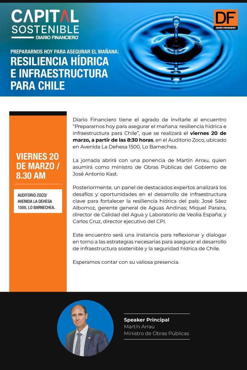 DIARIO FINANCIERO – Diario Financiero tiene el agrado de invitarle al encuentro “Prepararnos hoy para asegurar el mañana: resiliencia hídrica e Infraestructura para Chile” – La jornada abrirá con una ponencia de Martín Arrau, ministro de Obras Públicas