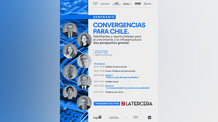 El Consejo de Políticas de Infraestructura CPI, SOFOFA, la Facultad de Economía y Negocios de la Universidad del Desarrollo y Chiile21, tienen el agrado de invitarle al seminario “Convergencias para Chile, habilitantes y oportunidades para el crecimiento y la infraestructura: una perspectiva gremial” que se transmitirá el línea por la tercera.
