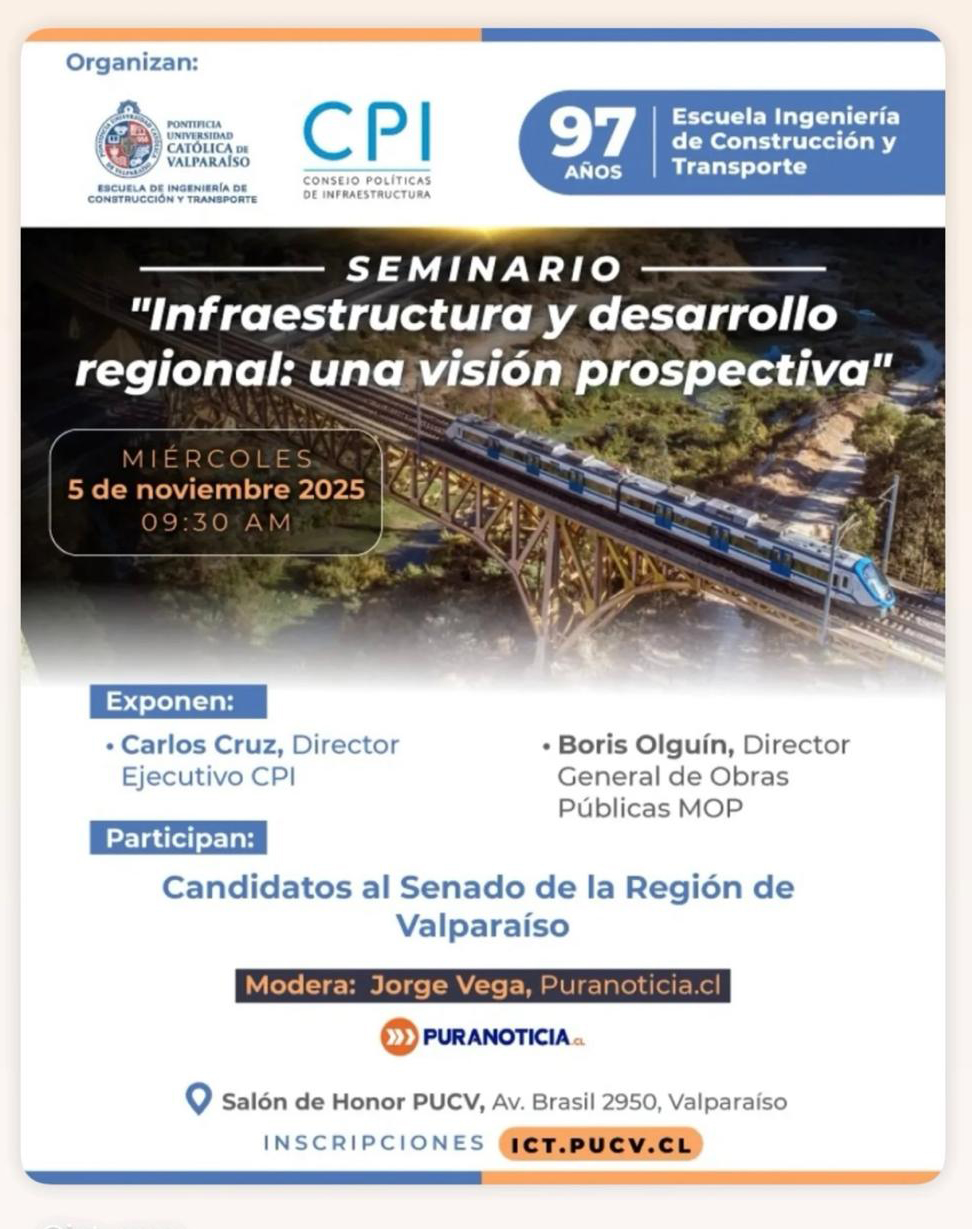 CPI – El miércoles 5 de noviembre a las 9:30 hrs, en el Salón de Honor PUCV, se realizará el seminario donde expondrán Carlos Cruz Director Ejecutivo CPI y Boris Olguín Director General de Obras Públicas. Participan los Candidatos al Senado de la Región de Valparaíso.