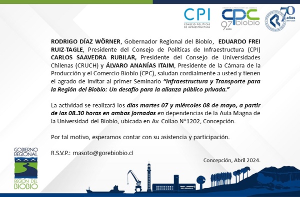 La actividad, coorganizada por el Gobierno Regional del Biobío; el Consejo de Universidades Chilenas (CRUCh Biobío – Ñuble); la Cámara de la Producción y el Comercio Biobío (CPC) y CPI, se está realizando los días martes 7 y miércoles 8 de mayo -a partir de las 08:30 horas– en dependencias del Aula Magna de la Universidad del Bío Bío (Concepción).