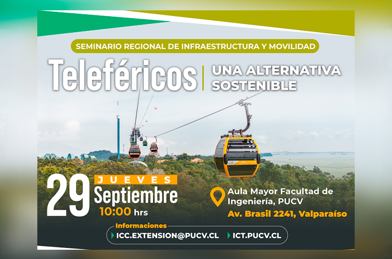 CPI – El Consejo de Políticas de Infraestructura (CPI) junto con la Escuela de Ingeniería de Construcción y Transporte de la Pontificia Universidad Católica de Valparaíso, organizan este seminario regional de infraestructura y movilidad, en torno a “Teleféricos: Una alternativa sostenible” que tendrá lugar en el Aula Mayor de la Facultad de Ingeniería de la PUCV (Av. Brasil 2241, Valparaíso), el jueves 29 de septiembre a las 10:00 horas.