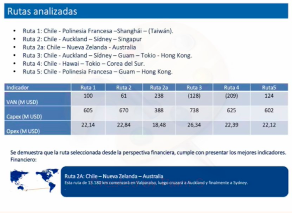 En total, su construcción requerirá de una inversión de US$ 388 millones, mientras que los costos operaciones serán de US$ 18,4 millones. Esta, la Ruta 2A, va entre Chile, Nueva Zelanda y Australia.