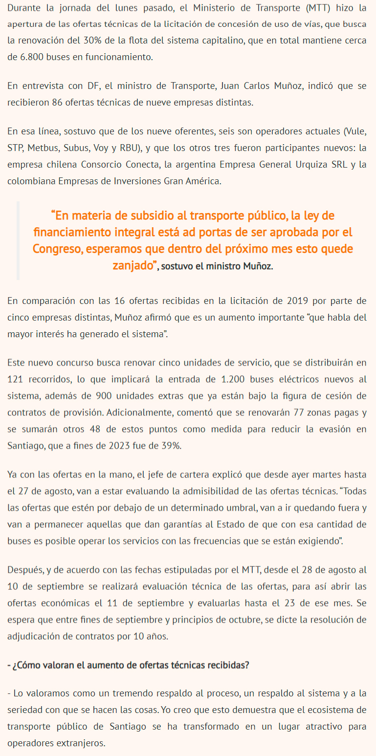 DIARIO FINANCIERO – En el marco del proceso que busca renovar el 30% de la flota del sistema de buses de la capital, el MTT recibió 86 ofertas técnicas de un total de nueve empresas