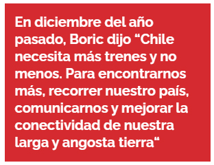 En efecto, Boric manifestó a comienzos de diciembre de 2021 que “Chile necesita más trenes y no menos. Para encontrarnos más, recorrer nuestro país, comunicarnos y mejorar la conectividad de nuestra larga y angosta tierra. Así que tranquilidad, que los cambios que vienen son para vivir mejor“, esto en respuesta al presidente de la Confederación Nacional de Transportes de Carga de Chile (CNTC), Sergio Pérez, quien había criticado la propuesta de gobierno del entonces candidato de Apruebo Dignidad, sobre la extensión de la línea férrea del transporte de carga.