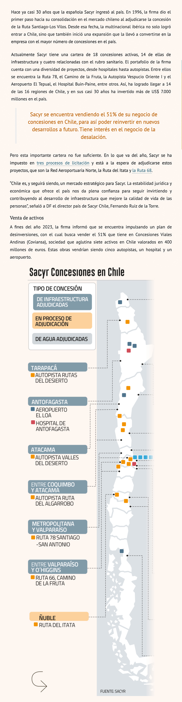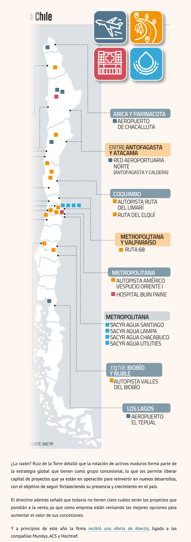 DIARIO FINANCIERO – La firma cuenta con 18 concesiones en el país, 14 de ellas de infraestructura y cuatro relacionadas con el rubro sanitario.