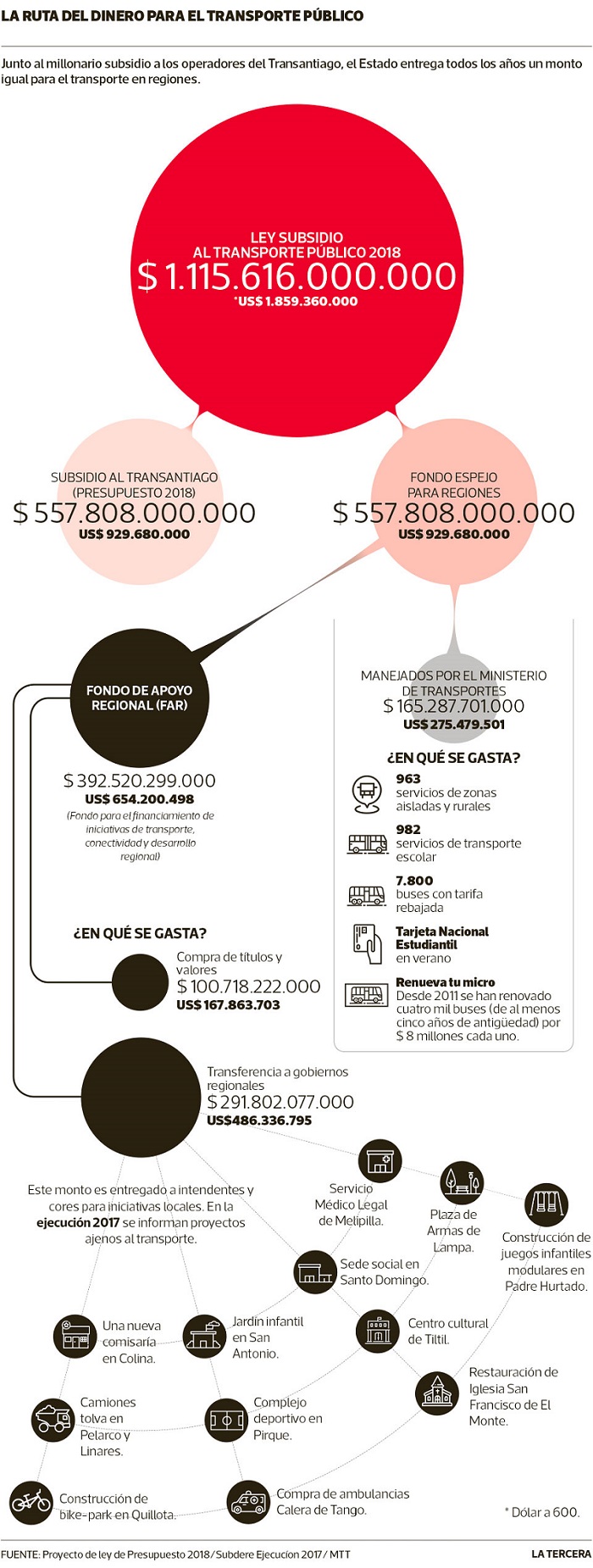 LA TERCERA – Son US$ 929 millones. El equivalente al puente del Chacao (US$ 869 millones), al nuevo aeropuerto de Santiago (US$ 900 millones) o a tres hospitales de alta complejidad. Esa es la cifra que destina el presupuesto de la nación 2018 como subsidio al transporte público en regiones.
