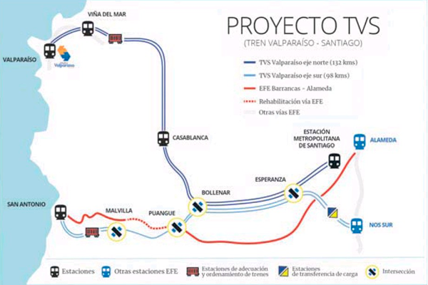 También incluye un ramal a San Antonio para el servicio de carga. Este proyecto considera una inversión de 2.400 millones de dólares, con trenes a 200 kilómetros por hora.