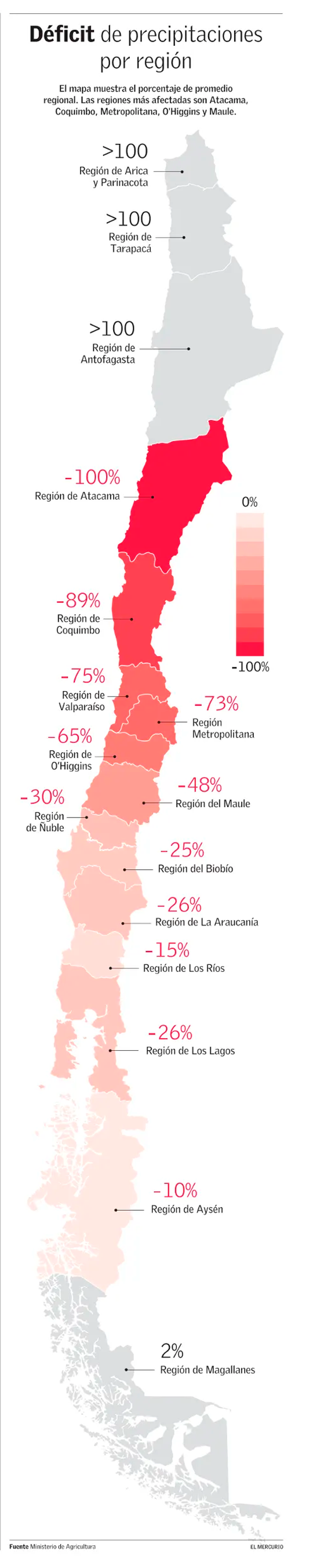 Ciento tres comunas, 1,4 millones de héctareas en riesgo, cuatro regiones en emergencia hídrica —con más del 60% de déficit— y dos más en evaluación. Crisis en la industria de la apicultura. Cuatro mil millones de pesos gastados en la urgencia.