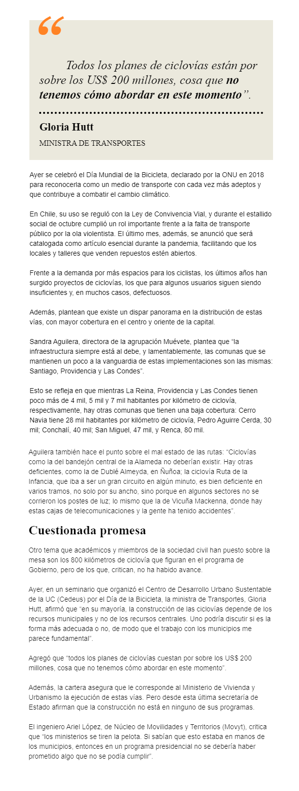 EL MERCURIO – Ciclistas acusan deficiente infraestructura y la ministra Gloria Hutt plantea que la construcción de ciclovías corresponde a los municipios.