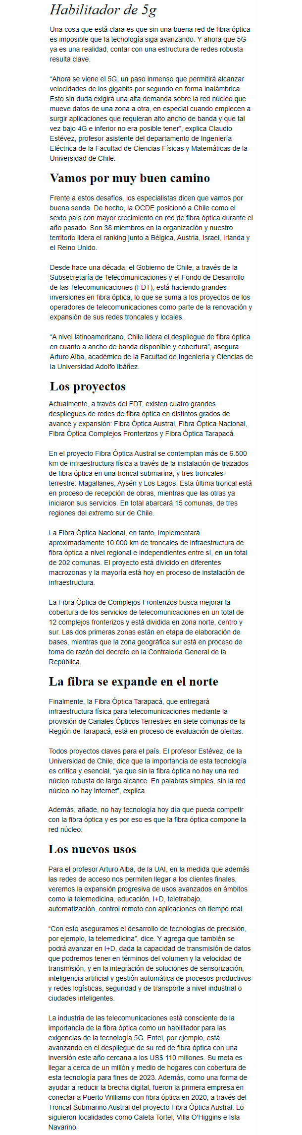 EL MERCURIO – La tecnología 5G y Las Carreteras de fibra óptica van de la mano en el desafío por otorgar mayor conectividad al país.