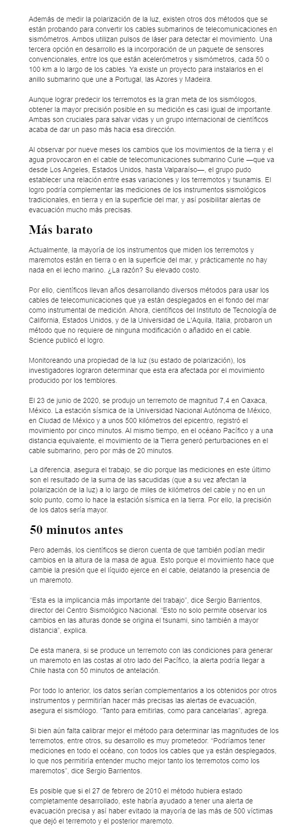 EL MERCURIO – Un nuevo método que mide los cambios que terremotos y tsunamis producen en estos cables de telecomunicaciones, posibilitará obtener muchos más datos sismológicos y del fondo del mar, donde, hasta ahora, no había información.