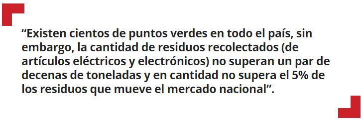 En cuanto a los artículos eléctricos y electrónicos, el catastro indica que “existen cientos de puntos verdes en todo el país, sin embargo, la cantidad de residuos recolectados no superan un par de decenas de toneladas y en cantidad no supera el 5% de los residuos que mueve el mercado nacional. Para las empresas gestoras son más importantes los convenios directos con las empresas generadoras de este tipo de residuos”.