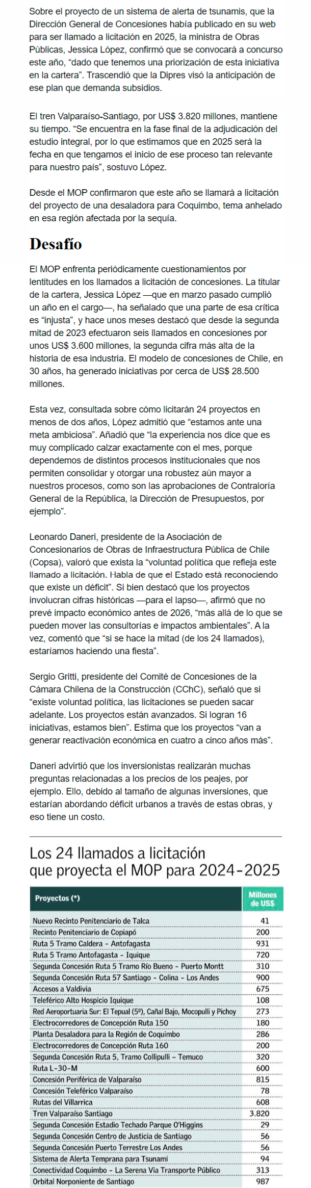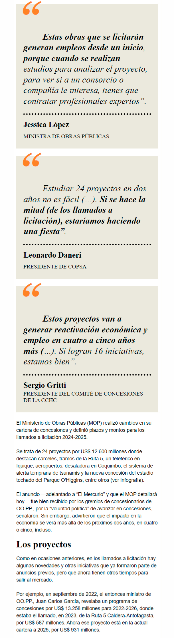 EL MERCURIO – MOP prevé licitar 24 proyectos por US$ 12.600 millones al cierre de 2025