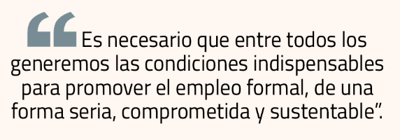 Es por eso, tan necesario que, dejando de lado motivaciones políticas, todos los incumbentes —el Ejecutivo, legisladores, empresarios, PYME y consumidores— generemos las condiciones indispensables para promover el empleo formal, de una forma seria, comprometida y sustentable. Dentro de las condiciones necesarias, nos referimos a retomar con fuerza los proyectos de infraestructura, grandes generadores de empleo. Al rol de los Ministerios de Salud, Vivienda y Obras Públicas, principalmente, para que permitan que los recursos fluyan sin trabas desde ellos a las empresas contratantes.