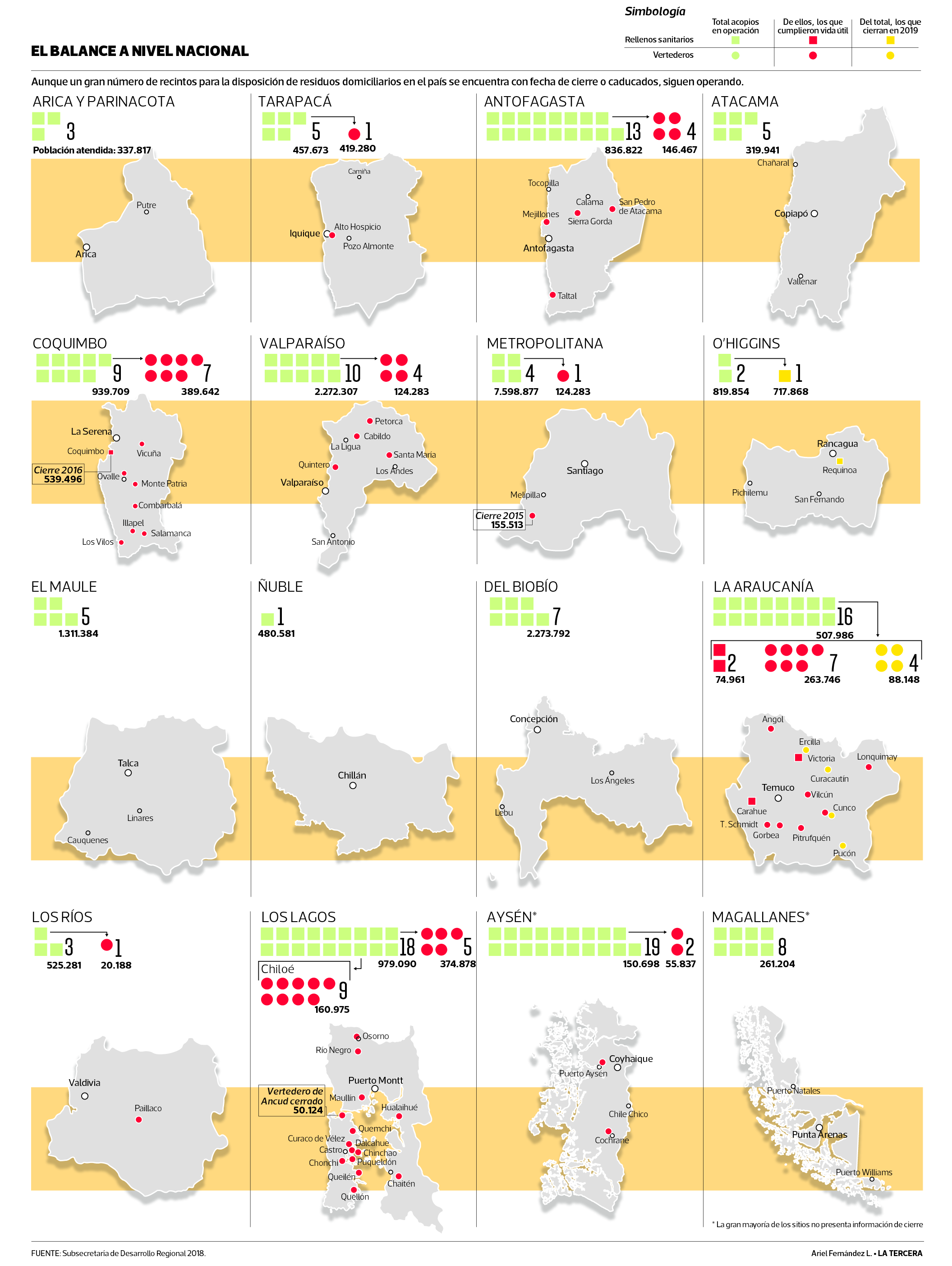 El análisis indica que hay 30 rellenos sanitarios; 52 vertederos; ocho rellenos manuales y 38 basurales. En el estudio se detalla que existen 43 recintos (rellenos y vertederos) que ya cumplieron su vida útil en las 16 regiones del país, pero aún siguen recibiendo material, lo que equivale a un 33% del total de acopios. Además, otros cinco puntos cumplirán su periodo este año. El catastro muestra que en el país hay vertederos que abrieron sus puertas en 1970, como es el caso de La Chimba, en la Región de Antofagasta, y Lebu, en el Biobío, que comenzó a recibir basura en 1950 (ninguno tiene fecha de cierre).