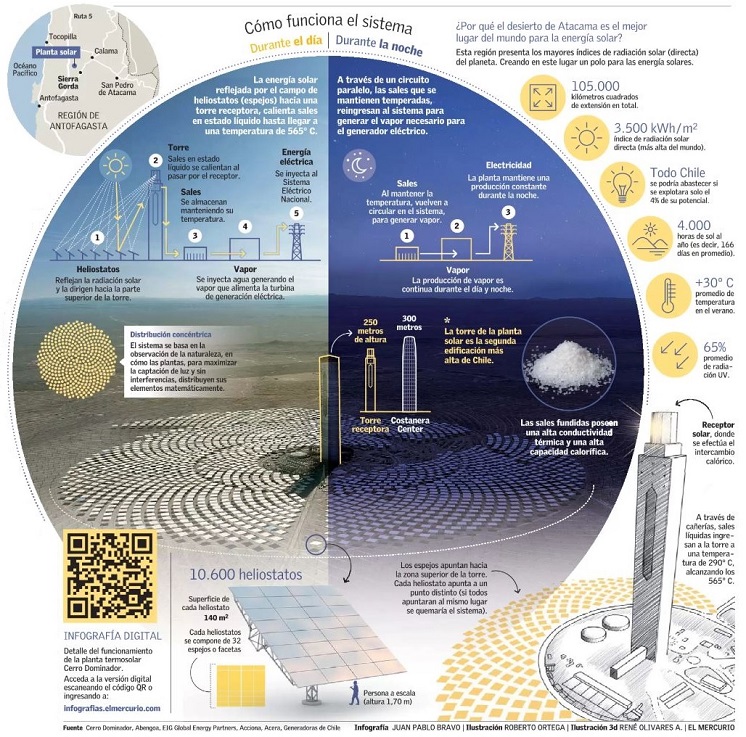 EL MERCURIO – La planta, única en América Latina, permitirá alimentar una ciudad como Antofagasta en forma permanente. Se trata de un tipo de tecnología que pavimenta el camino para transformar al sol en la principal fuente de la electricidad del país.
