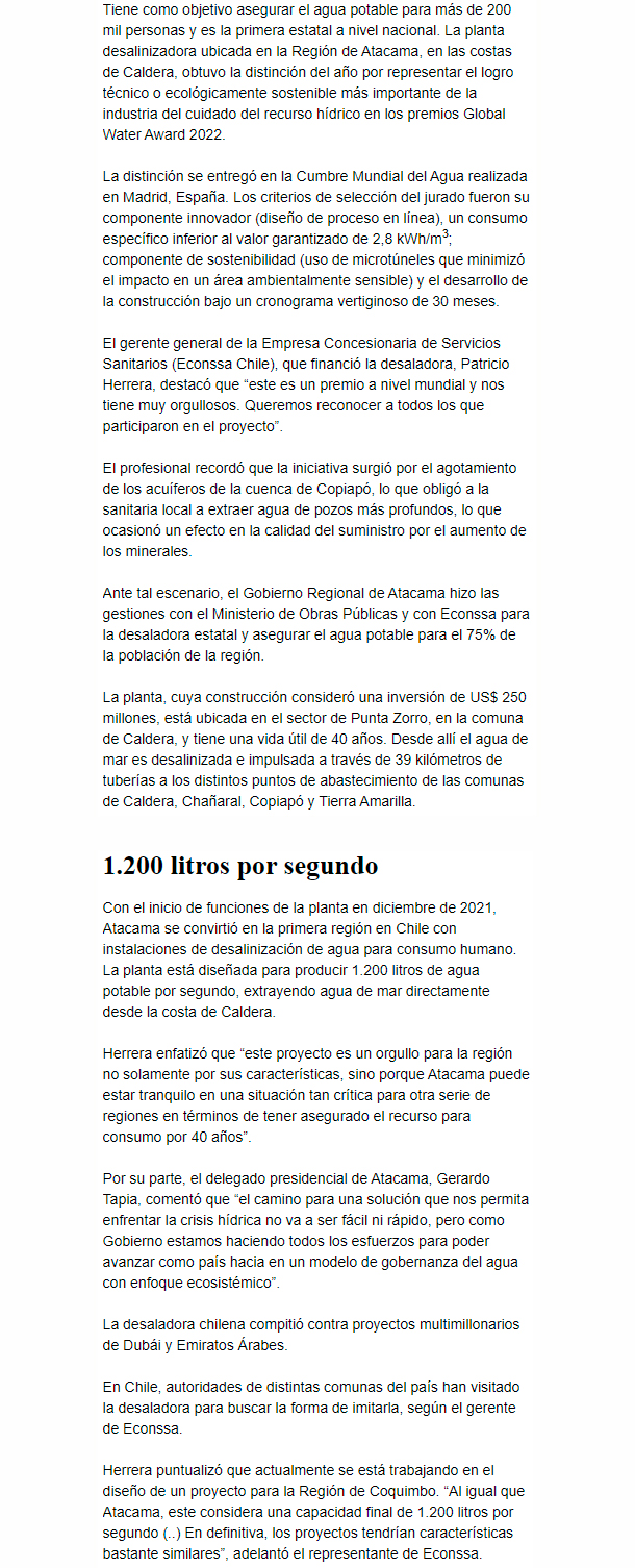 EL MERCURIO – La estructura se llevó el galardón a la mejor del año, en los Global Water Award 2022, realizado en España. Su bajo impacto ambiental fue destacado por los especialistas.