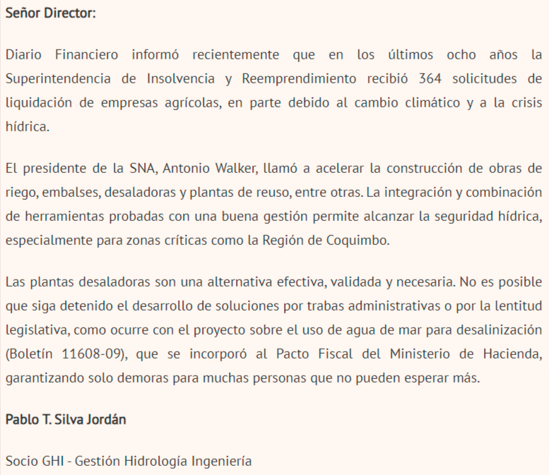 DIARIO FINANCIERO – Las plantas desaladoras son una alternativa efectiva, validada y necesaria