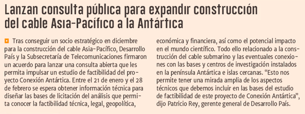 DIARIO FINANCIERO – Desarrollo País y la Subsecretaría de Telecomunicaciones firmaron un acuerdo para lanzar consulta que les permita impulsar un estudio de factibilidad.