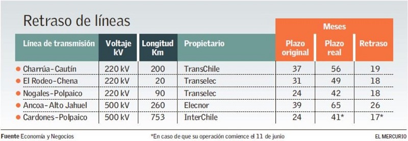 Por su parte, el proyecto Charrúa-Cautín (220 kV), de 200 kilómetros de largo, se demoró 19 meses más de lo planeado.