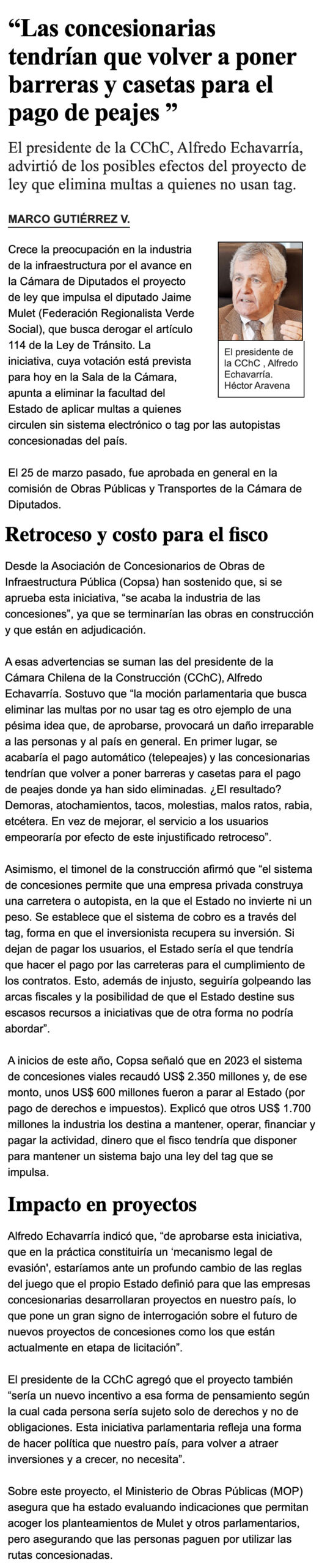 EL MERCURIO – El presidente de la CChC, Alfredo Echavarría, advirtió de los posibles efectos del proyecto de ley que elimina multas a quienes no usan tag.