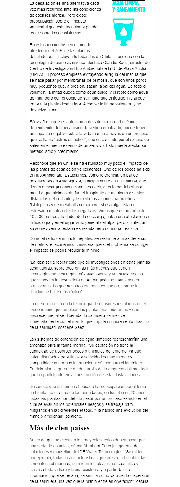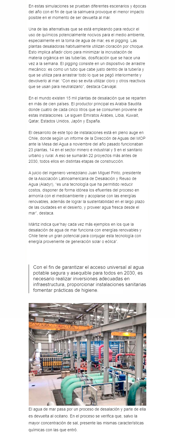 EL MERCURIO – Sistemas que reducen la concentración de la salmuera descargada al mar y la limpieza de las tuberías sin el uso de químicos son algunas de las tecnologías que se están aplicando en estos procesos para obtener agua para el consumo humano o la minería.