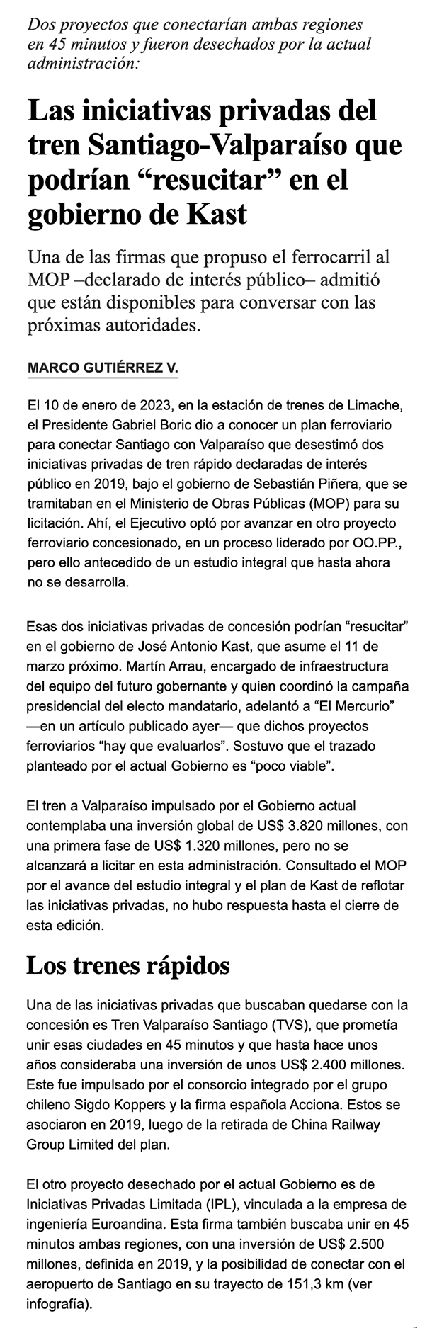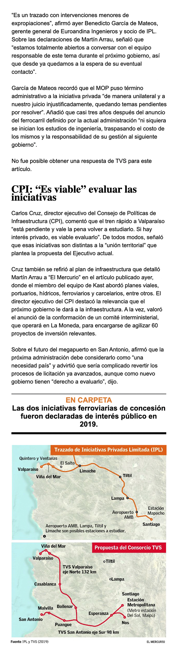 EL MERCURIO – Una de las firmas que propuso el ferrocarril al MOP –declarado de interés público- admitió que están disponibles para conversar con las próximas autoridades. CPI: “Es viable” evaluar las iniciativas.
