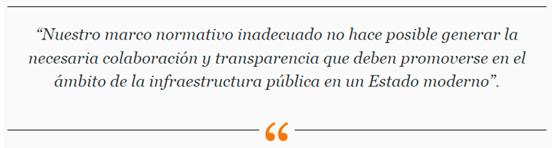 Este marco normativo inadecuado no hace posible generar la necesaria colaboración y transparencia que deben promoverse en el ámbito de la infraestructura pública en un Estado moderno, ni se condice con las normas y prácticas internacionales vigentes hoy en materia de proyectos de ingeniería y construcción.