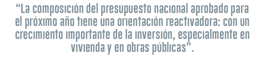 Una buena noticia, porque más allá de la normalización del gasto total, la composición del presupuesto aprobado tiene una orientación reactivadora: con un crecimiento importante de la inversión, especialmente en vivienda y en obras públicas con crecimientos crecimientos de 8,6 y 12,9%, respectivamente, y de recursos focalizados destinados a fomentar el empleo y la capacitación.