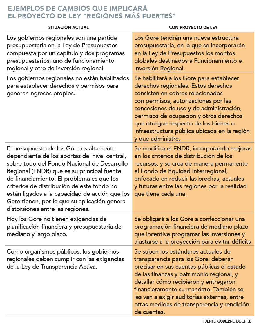 Se trata de otra etapa de la descentralización impulsada desde el Gobierno, que ayer tuvo un hito: con urgencia ingresó a la Cámara de Diputados el proyecto de ley que fortalece a los gobiernos regionales (Gores) al dictar normas para su financiamiento y elevar la responsabilidad en la administración de los dineros.