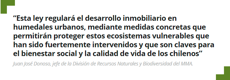 “Esta ley regulará el desarrollo inmobiliario en humedales urbanos, mediante medidas concretas que permitirán proteger estos ecosistemas vulnerables que han sido fuertemente intervenidos y que son claves para el bienestar social y la calidad de vida de los chilenos”, resume el jefe de la División de Recursos Naturales y Biodiversidad del MMA.