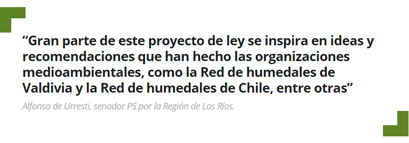 Así, en junio de ese año el senador De Urresti ingresó al Congreso el proyecto de ley “Modifica diversos cuerpos legales con el objetivo de proteger los humedales urbanos”. La moción fue firmada además por los senadores Isabel Allende (PS), Adriana Muñoz (PPD), Víctor Pérez Varela (UDI) y Patricio Walker (DC), pero no contaba con el respaldo del gobierno. En junio de 2018 la entonces ministra de Medio Ambiente, Marcela Cubillos, señaló que “no creemos que deba existir una protección específica para humedales o glaciares”.