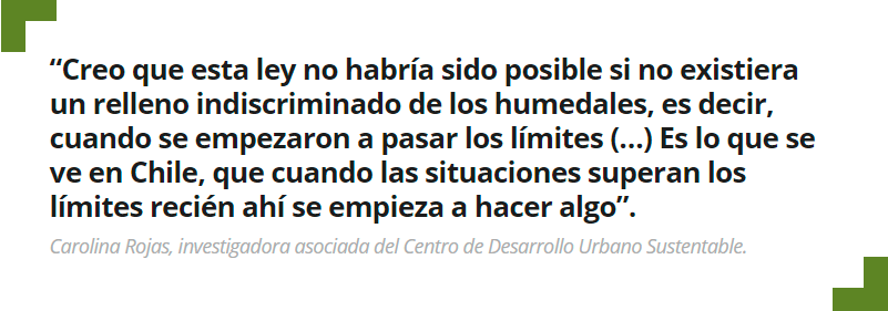 La investigadora de Cedeus señala que debido al vacío legal la degradación de los humedales urbanos llegó a una situación insostenible, y que luego de mucha presión de parte de las comunidades y del ámbito científico se inició la tramitación del proyecto legislativo. “Creo que esta ley no habría sido posible si no existiera un relleno indiscriminado de los humedales, es decir, cuando se empezaron a pasar los límites (…) Es lo que se ve en Chile, que cuando las situaciones superan los límites recién ahí se empieza a hacer algo”.