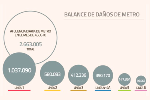 A modo general, en el último balance de daños la empresa dijo que durante los días más álgidos de la crisis, 25 estaciones fueron incendiadas, dentro de las cuales siete fueron completamente quemadas en los primeros 15 días del conflicto social.