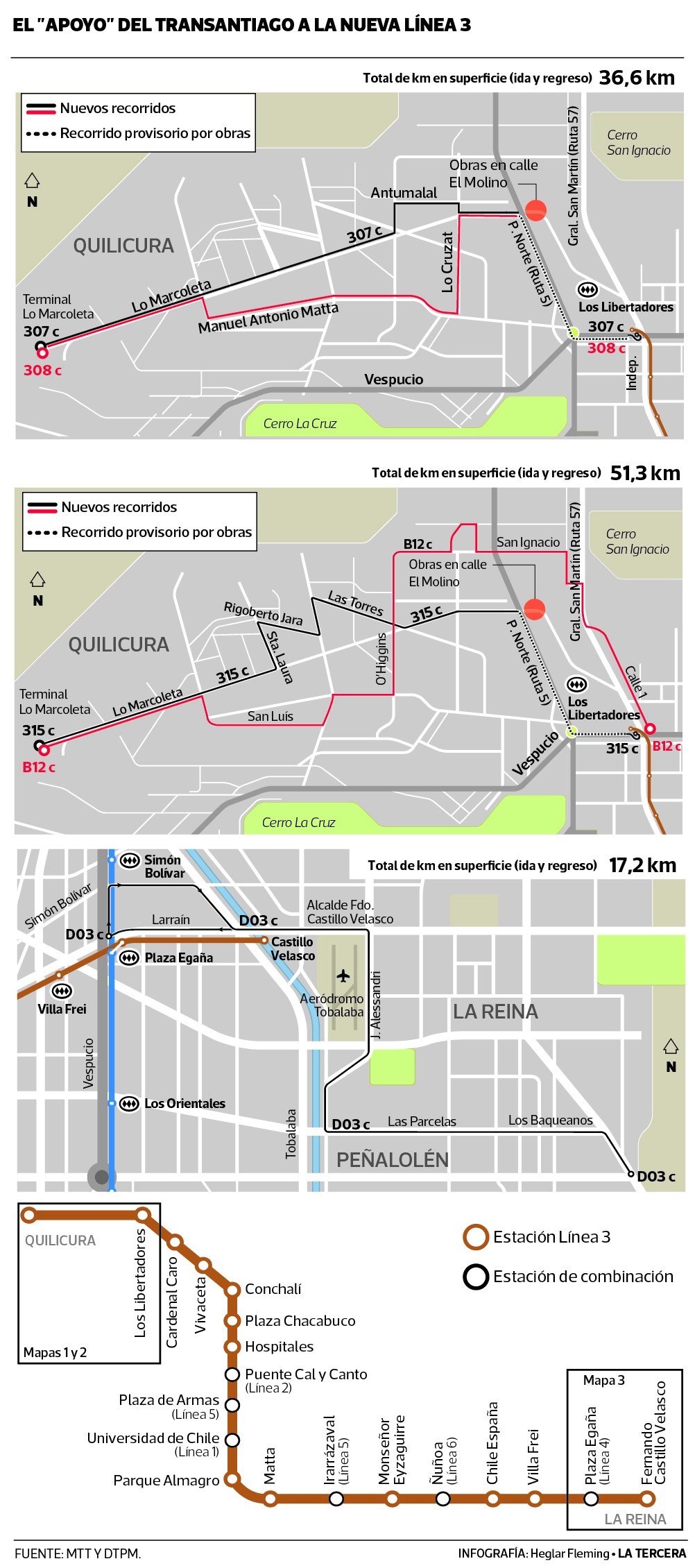 De esta manera, se sumarán seis nuevos recorridos de buses junto con la puesta en marcha de la línea. De ellos, cuatro conectarán distintos sectores de Quilicura con la futura Estación Los Libertadores. Otro unirá el sector de Las Parcelas, en Peñalolén, con la Estación Fernando Castillo Velasco. Un sexto recorrido conectará la comuna de San Bernardo con Estación Mapocho, con la idea de suplir la disminución de frecuencia del recorrido 201, que abarca desde Quilicura hasta San Bernardo.