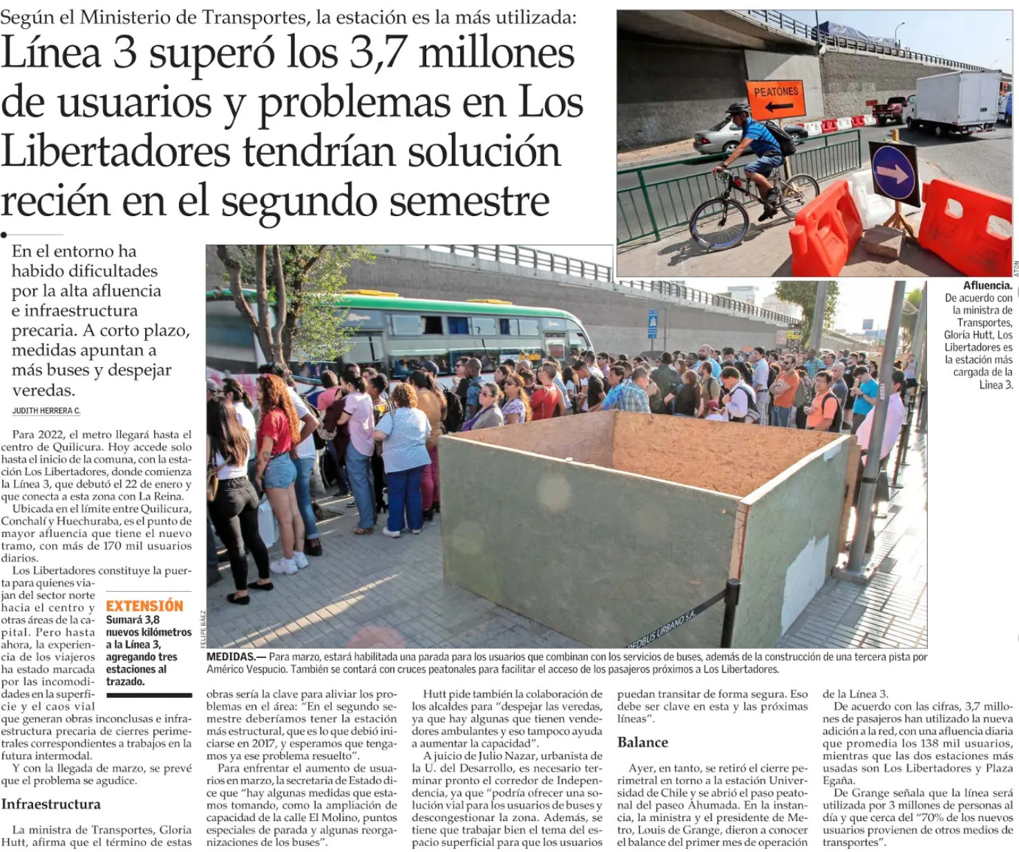 Línea 3 superó los 3,7 millones de usuarios y problemas en Los Libertadores tendrán solución recién en el segundo semestre
