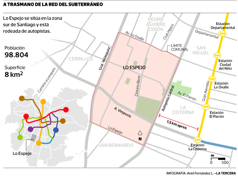 El concejal Nibaldo Ahumada (DC) sostiene que desde hace décadas se la ha propuesto la idea de tener tren subterráneo a diversas autoridades, pero Lo Espejo siempre queda fuera de los planes oficiales: “Es una comuna muy castigada, con déficit de todo tipo”, dice. Describe que no tienen mall, que solo este año llegó un banco, que no hay farmacias de grandes cadenas y que poseen solo cuatro cajeros automáticos, por lo que la comuna depende de los servicios de Maipú y San Bernardo.