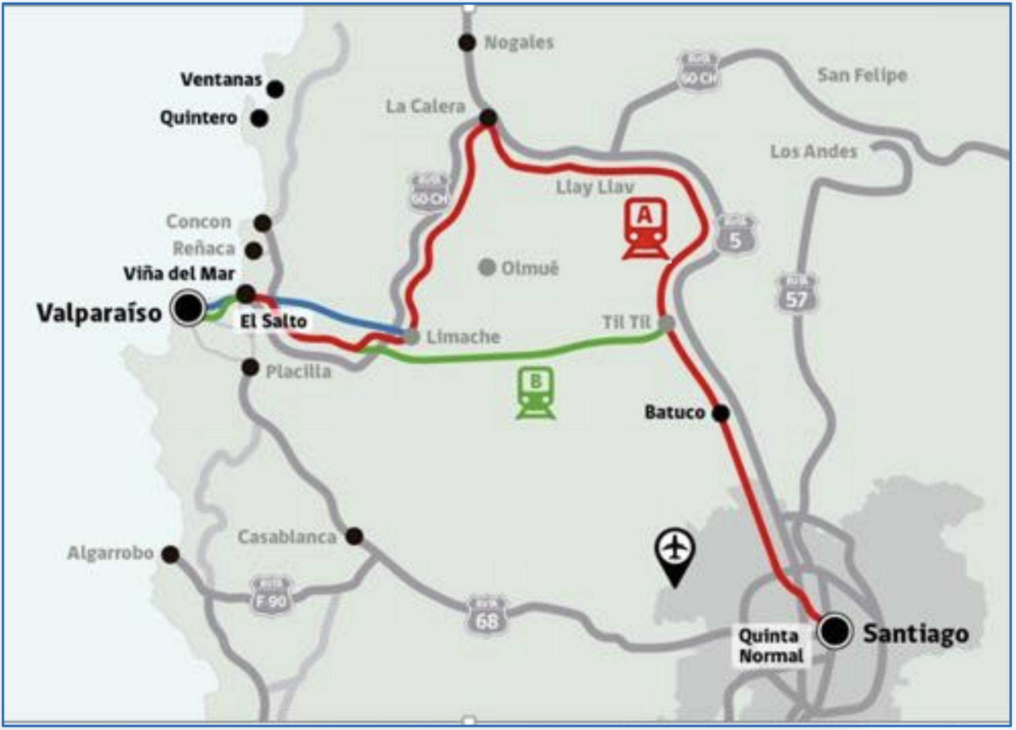 Para lograr dicho objetivo, la Dirección de Concesiones del Ministerio de Obras Públicas ha establecido que se privilegiará la infraestructura ferroviaria existente, complementando la red ferroviaria con un alto estándar y nivel de servicio.