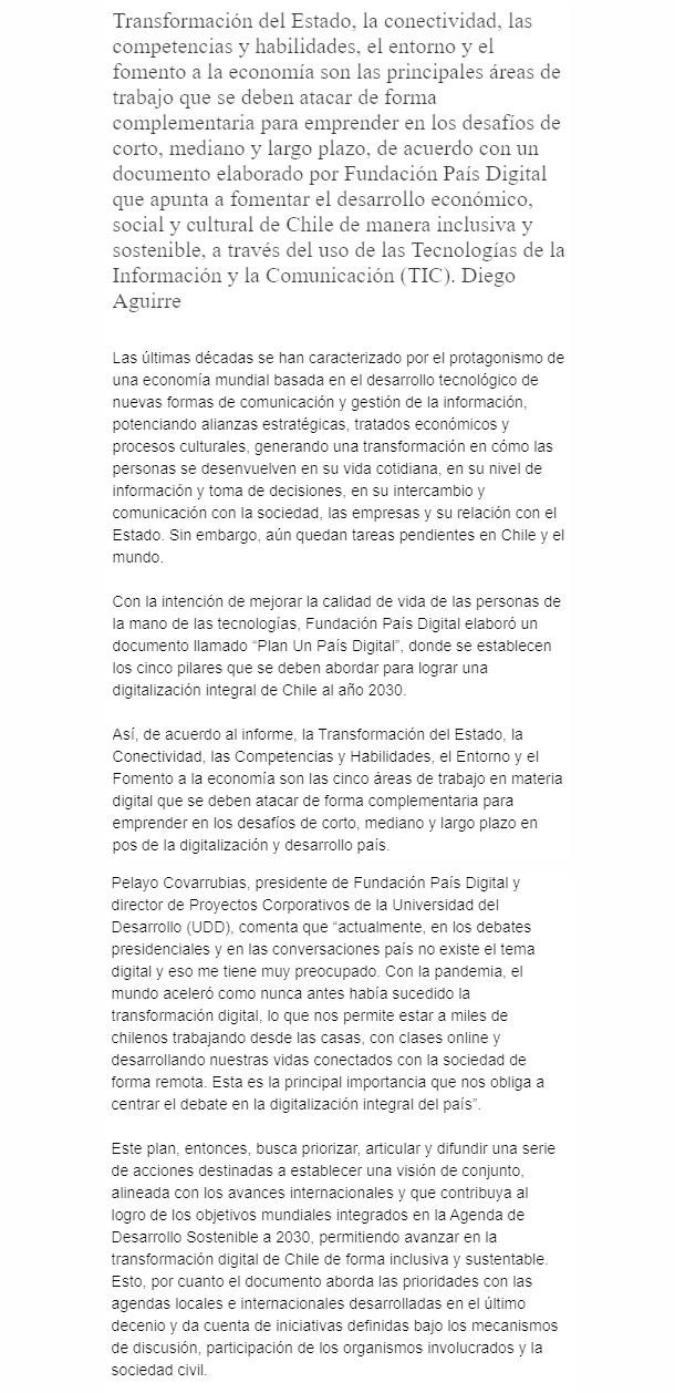 EL MERCURIO – Con la intención de mejorar la calidad de vida de las personas de la mano de las tecnologías, Fundación País Digital elaboró un documento llamado “Plan Un País Digital”, donde se establecen los cinco pilares que se deben abordar para lograr una digitalización integral de Chile al año 2030.