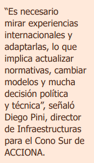 En esa línea, Diego Pini señaló que desde ACCIONA decidieron, hace ya un tiempo, incluir el factor sustentabilidad en su modelo de negocio. “No sólo como una cultura, sino que a través de procesos constructivos e iniciativas concretas”, precisó el ejecutivo, como algunos procesos de la Comunidad Europea en los que se han involucrado, para tratar de replicar experiencias positivas en Chile.