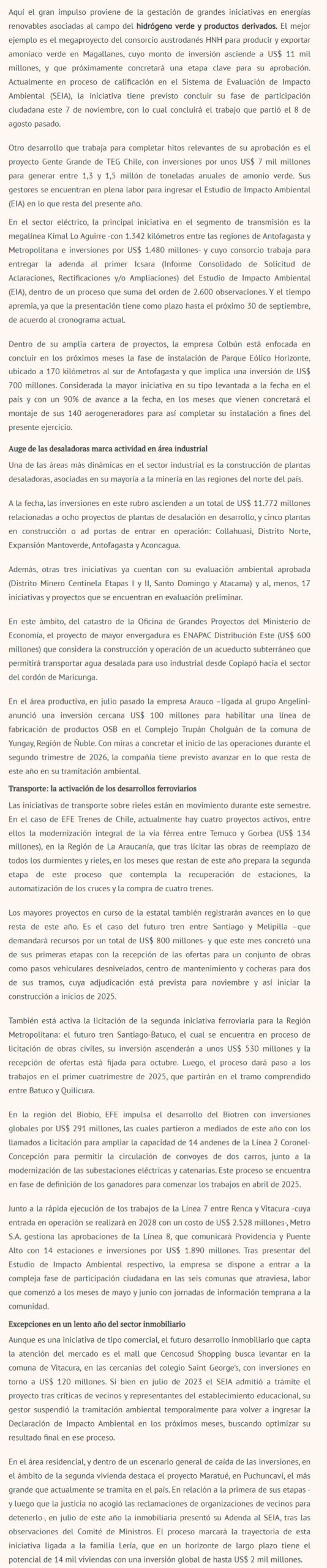 DIARIO FINANCIERO – Desarrollos en energías verdes, una sostenida inversión en mineras y desaladoras y materializar los planes en concesiones de infraestructura y ferrocarriles, mantendría la actividad en la segunda mitad de este año