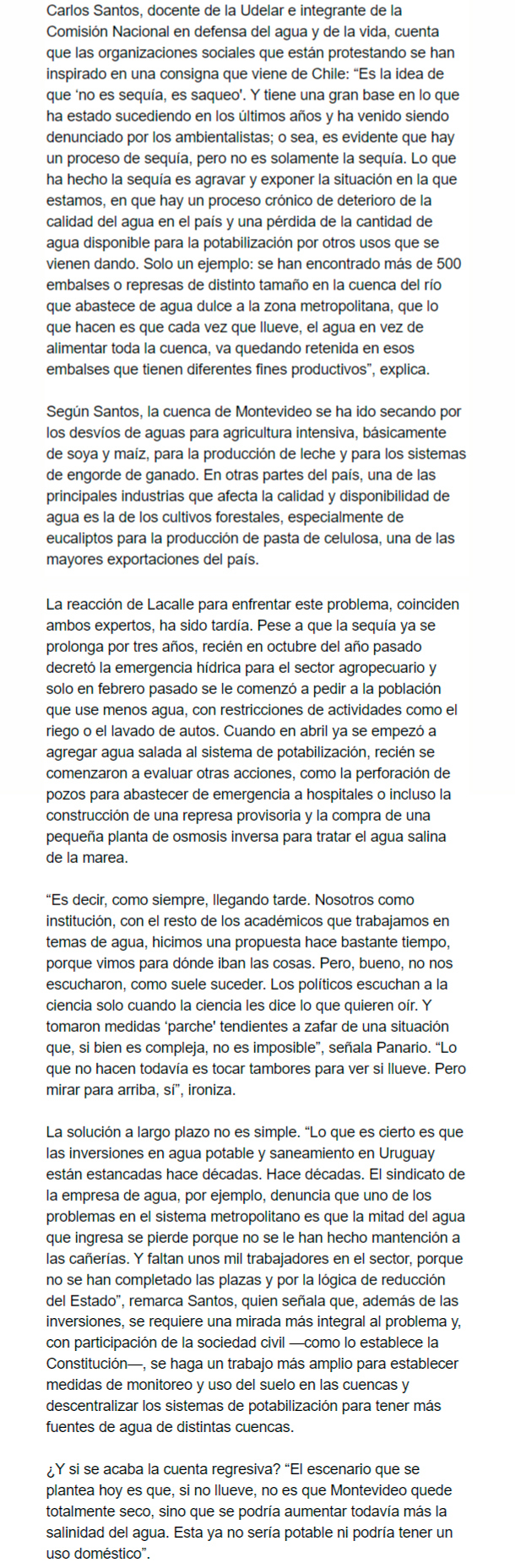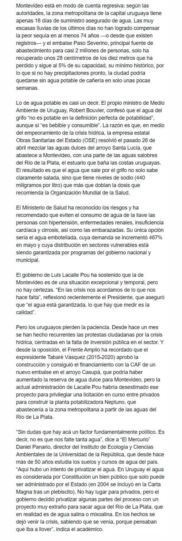 EL MERCURIO – No solo el clima, sino además la falta de inversión y el sobreconsumo de industrias extractivas llevaron a Montevideo a una situación límite, en la que el agua sale cada vez más salada.