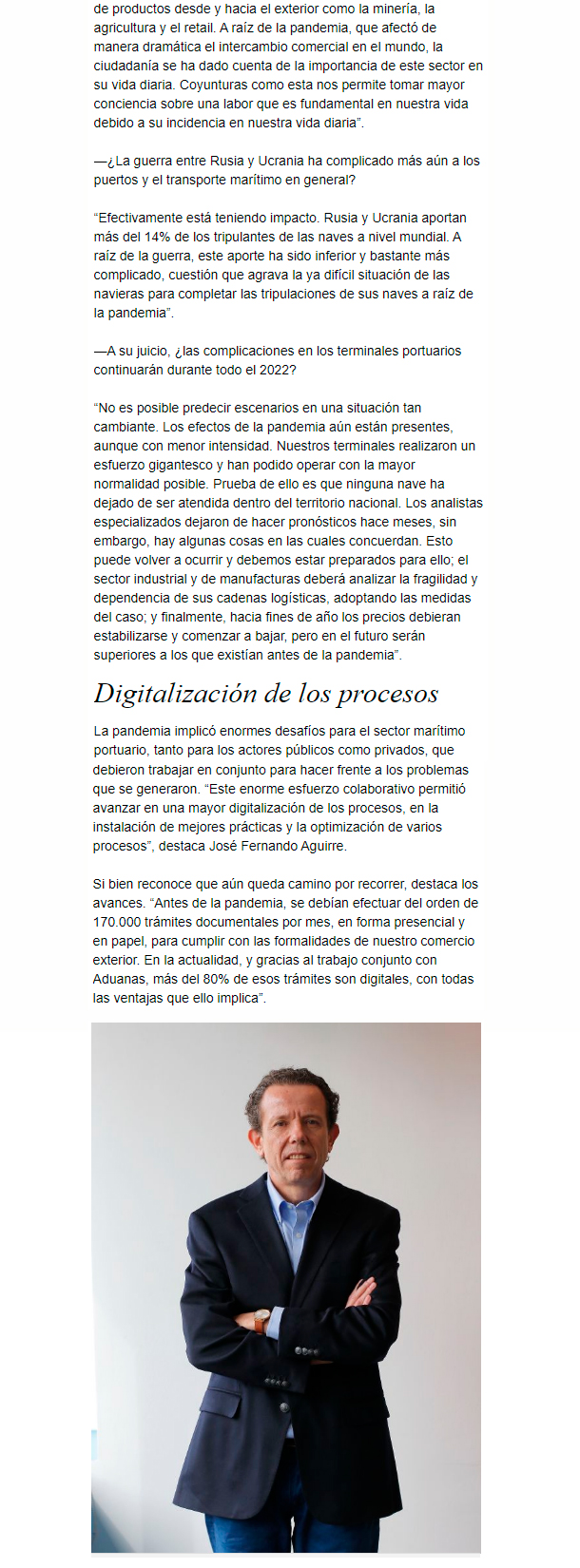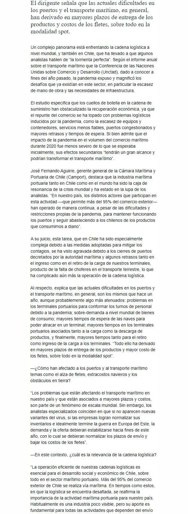EL MERCURIO – José Fernando Aguirre, gerente general de Camport señala las actuales dificultades en los puertos y el transporte marítimo en general.
