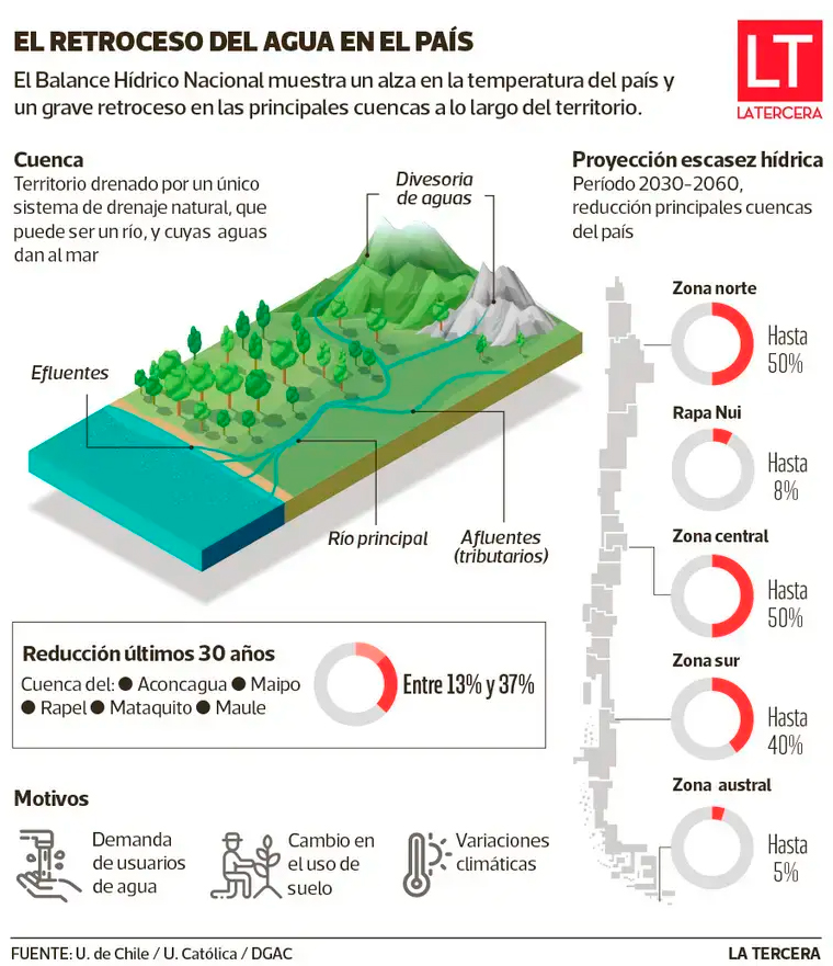 Cada 30 años, Chile hace un balance de la disponibilidad de sus recursos hídricos. La Dirección General de Aguas (DGA) presenta el estado del país en la materia. Su última actualización se realizó en 2021, y no arrojó buenas noticias, proyectando escasez de agua de hasta 50%. El informe anticipa la disponibilidad del agua hasta el año 2060 en el país y proyecta que para el período 2030-2060, su disponibilidad en el norte y centro de Chile podría disminuir más de 50%.