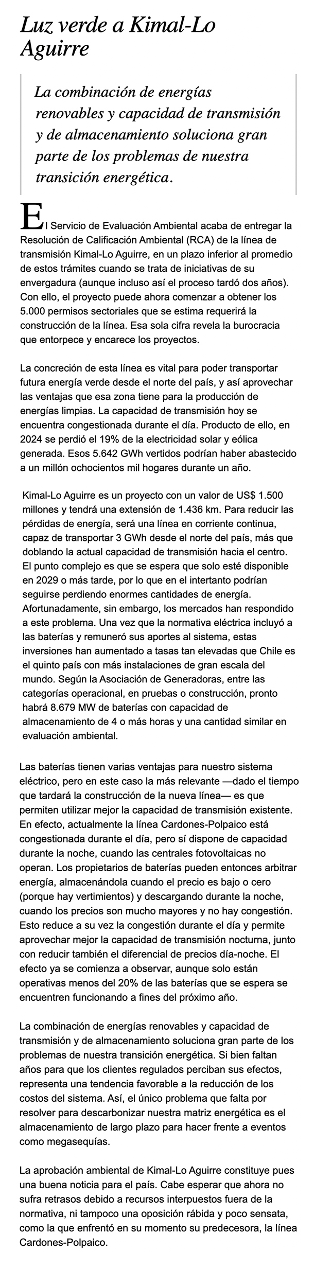 EL MERCURIO – La combinación de energías renovables y capacidad de transmisión y de almacenamiento soluciona gran partte de los problemas de nuestra transición energética.